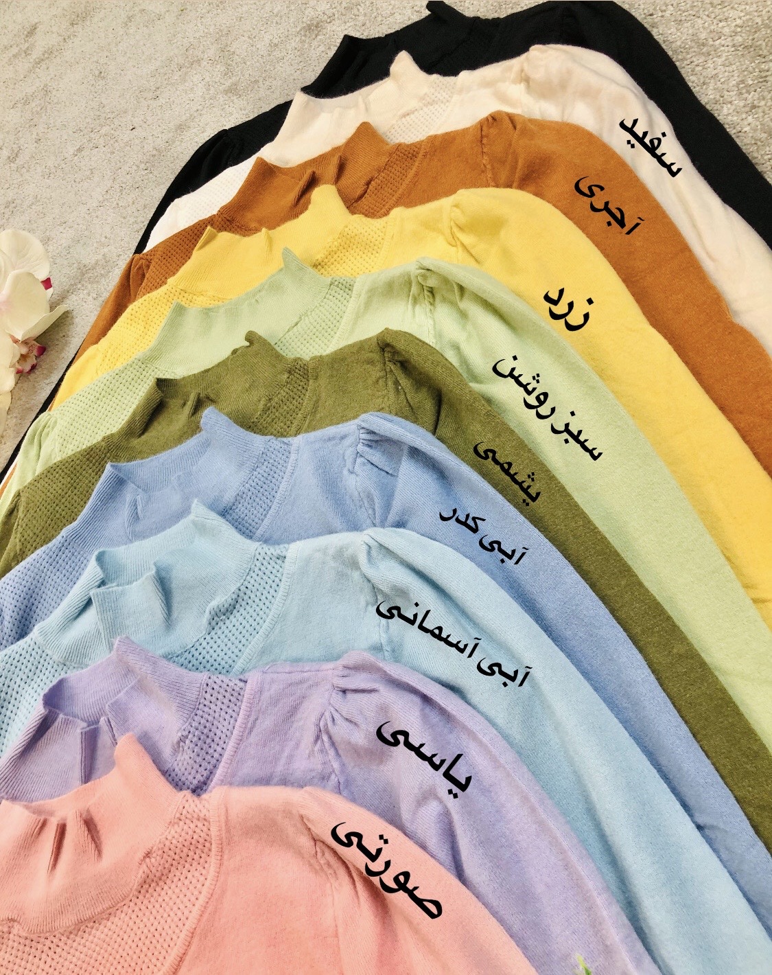 | رنگ | اجری, زرد, سفید, صورتی, مشکی, یاسی, ابی اسمانی, ابی کدر, سبز روشن, یشمی |