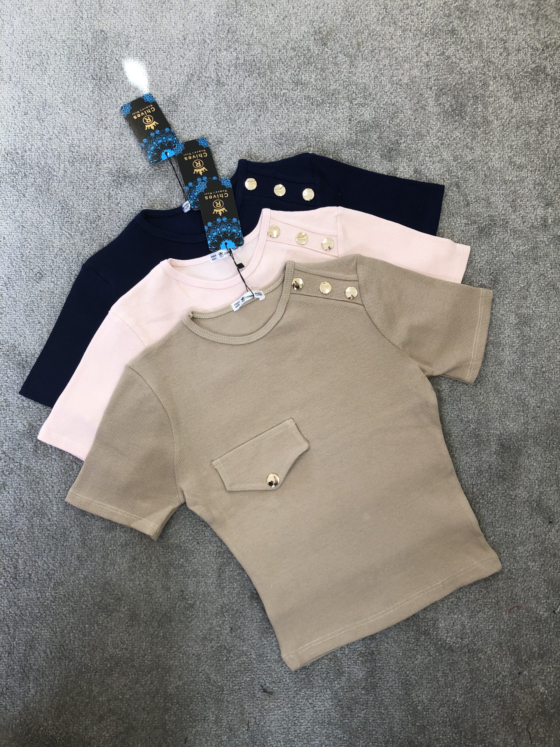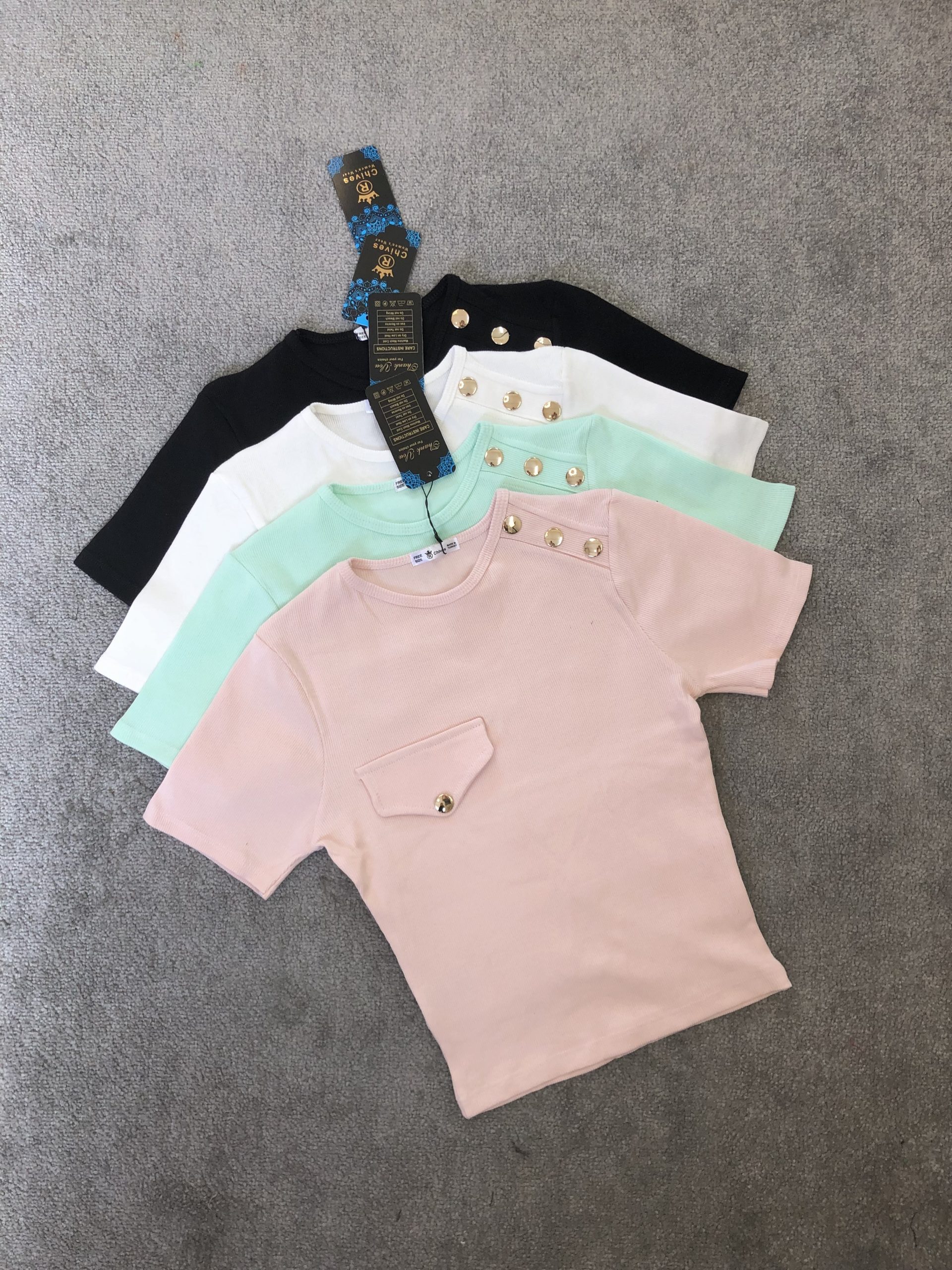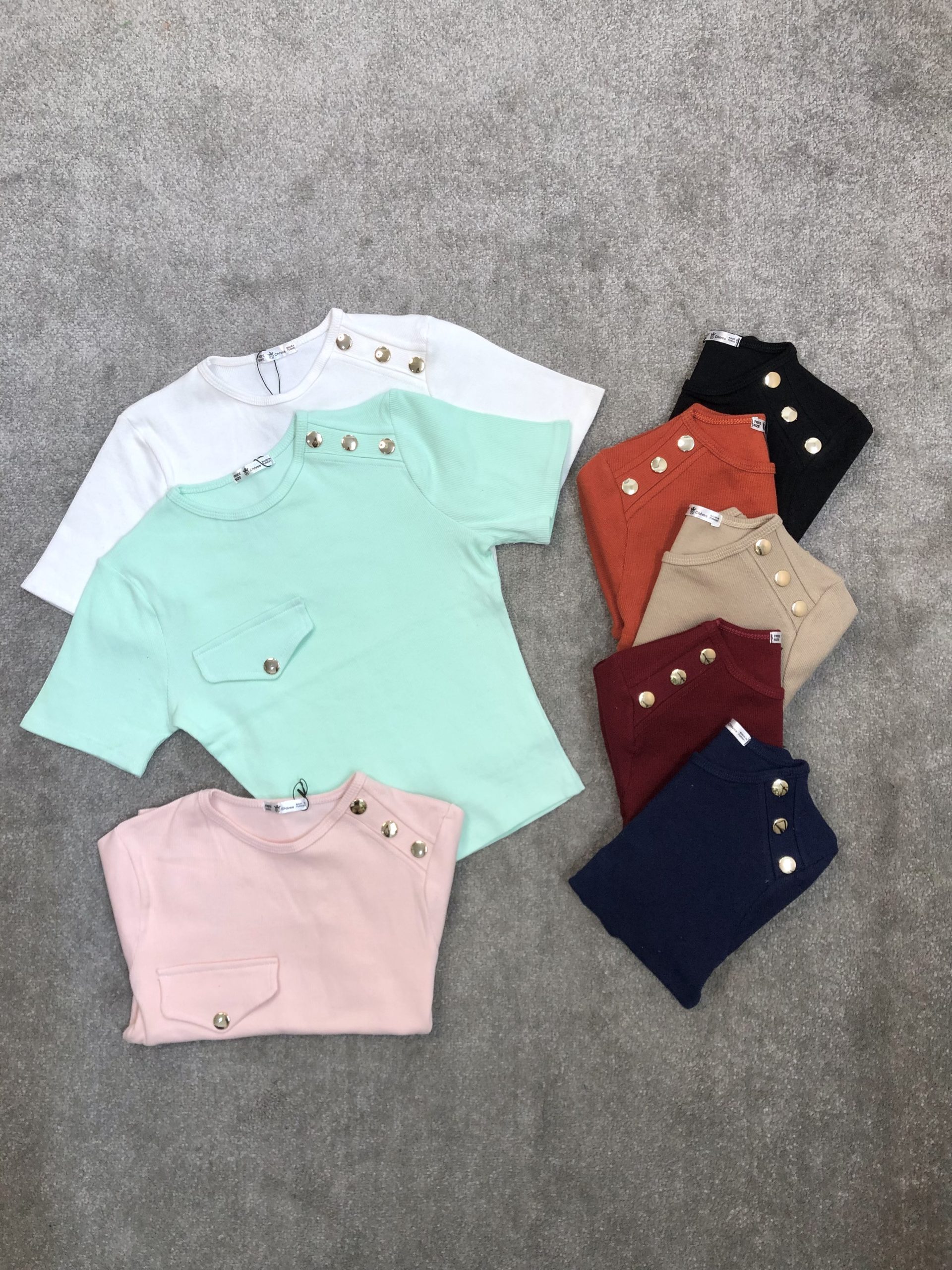 کراپ تیشرتی تک جیب سرشانه دکمه(3737)