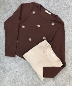 کراپ تیشرت گلدوزی شنل(3706) - قهوه ای